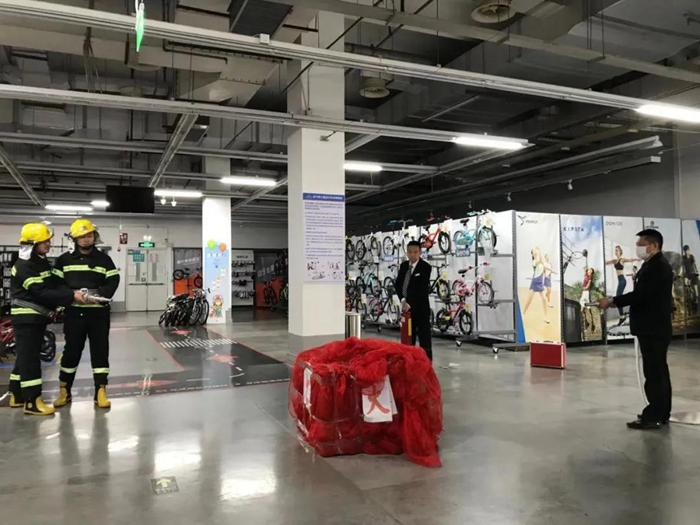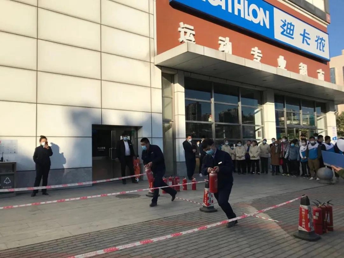 演練結束后,還組織了消防基本技能實操技能評比,采取同場競技方式,華騰拓展公司和迪卡儂抽點消火栓實操各一組、滅火器實操各4組,共20人參加實操的評比,通過比拼“滅真火、真出水”,達到“小火會用滅火器、大火會用消火栓”的要求,使每一位參加人員成為“見火不慌、抬手就滅”的準消防員,檢驗了前期“一警六員”消防基本技能實操實訓的成果。