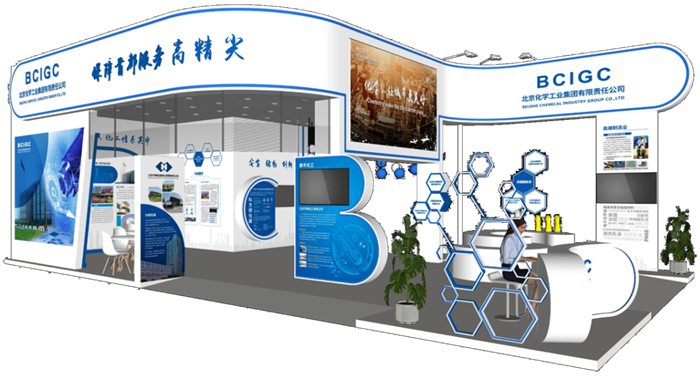 北京化工集團(tuán)所設(shè)展臺(tái)突出“化學(xué)讓未來(lái)更美好”理念,將所屬企業(yè)進(jìn)行集中整合,實(shí)現(xiàn)集約化參展。展臺(tái)通過(guò)華騰橡塑公司的橡塑手套加上炫彩效果,融入化學(xué)工業(yè)試管造型(頂部結(jié)構(gòu))、原子造型(造型伸縮燈球,現(xiàn)場(chǎng)展示不同造型)、分子結(jié)構(gòu)(苯環(huán)造型)等化學(xué)元素,柔和加入聲光效果,提升展臺(tái)氛圍效果,以弧形結(jié)構(gòu)為紐帶,敞開(kāi)懷抱,擁抱大眾,讓化學(xué)走入人們的生活,以開(kāi)放形態(tài)創(chuàng)造美好生活!